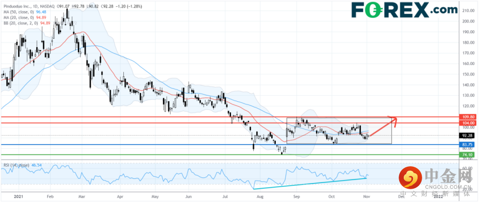 从技术角度看,如日线图所示,拼多多股价短线形成了一个盘整区,前景审慎看涨。目前它在20日及50日移动均线附近徘徊,相对强弱指标仍然呈现上升趋势。