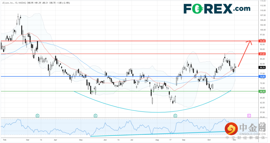 中国电商巨头 京东集团 (美国预托证劵编号: JD)由8月低位反弹逾3成。目前,股价年初至今只回落6%,表现心大部份的中资科技优胜。