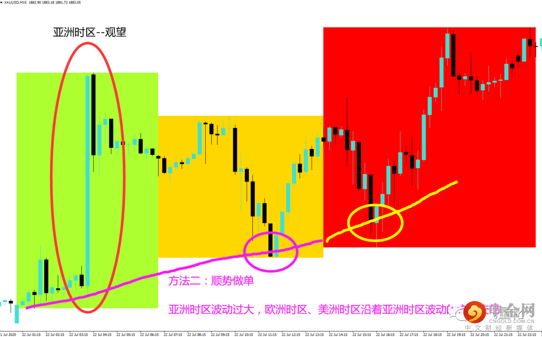 红色区域为美盘时区,是美国华尔街工作的时间,金融市场波动最为剧烈。如此简单的规律,每天不断的重复,聪明的你,一定要把握住哦!