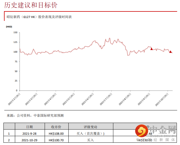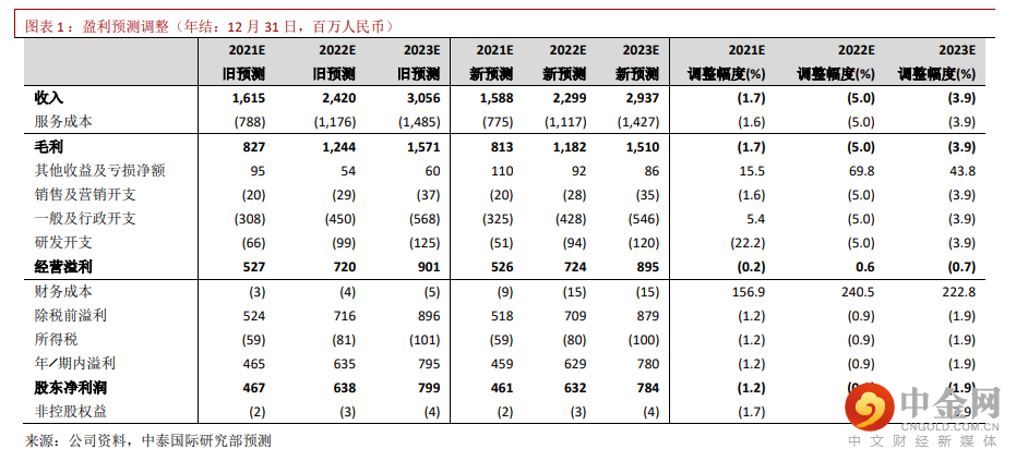 考虑到三季度收入略低,我们略微调整收入预测,但是由于研发费用率下降与利息收入增加等原因,2021-23E 股东净利润预测仅轻微下调 1.2%、0.9%、1.9%。公司股东净利润将维持快速增长,2020-23E CAGR 将高达 35.8%。我们仍然按照 64.5 倍 2022E PER 定价,目标价从 131.48 港元微调至 130.00 港元,重申“买入”评级。