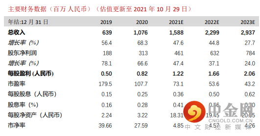 根据我们的了解,公司 2020 年全年的新增订单总额为约 17 亿元,而 2021 年 1-9 月份已超 20 亿元。截止 9 月底公司在手订单总额同比增长超 70%至超 30 亿元。公司订单多数在 1~2 年内兑现,而且管理层表示,随着公司品牌知名度的提升,金额较大的订单在增加。从财报中的先行指标看,2021 年 9 月底的合同负债金额(客户垫付款项等)较年初增长 78.2%,未来业绩能见度很高。我们预计公司收入将从 2020 年的约 10.8 亿元增加到2023 年的 29.4 亿元,2020-23E CAGR 为 39.8%。