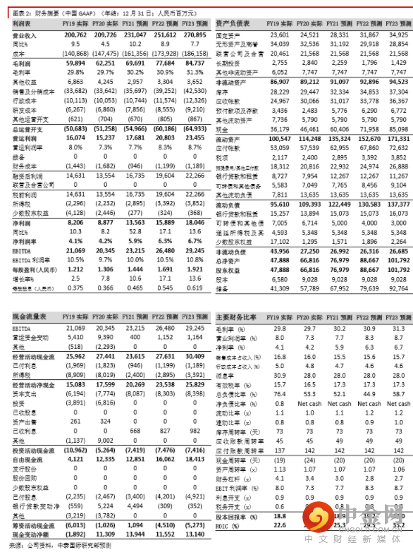 维持 FY21E/FY22E 收入为 2,310 亿/2,516 亿元的预期,同比增长 10.2%/8.9%,毛利率为30.2%/30.9%,净利润 136 亿/159 亿元。我们维持前瞻性市盈率 20 倍的估值,目标价为39.0 港元。我们长期看好公司全球化和高端化的品类结构以及打造智能化家电场景应用的换道策略。重申“买入”评级。