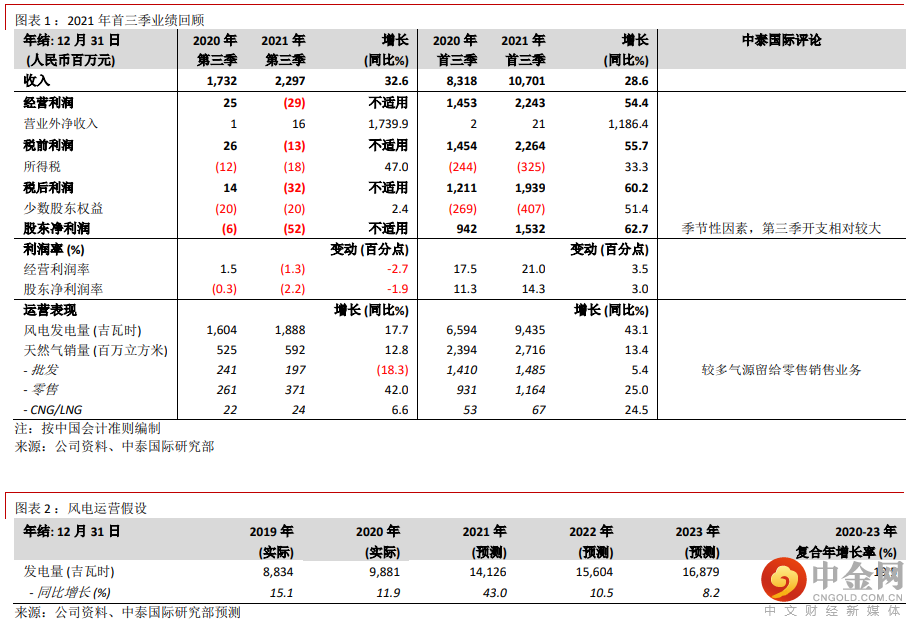 公司近日公布理想的2021年首三季业绩。收入及股东净利润分别同比上升28.6%及62.7% 至 107.0 亿元及 15.3 亿元人民币(同下),主因:(一)风资源强劲及风电总装机容量增加,风电发电量同比上涨 43.1%;(二)天然气零售需求良好,总气销量同比上升 13.4%,其中零售量同比增加 25.0%。第三季批发量同比下跌 18.3%,因为将较多气源保留给零售销售业务所需,季度零售量因此同比大幅上涨 42.0%;(三)运营效率提升,经营利润率同比上升 3.5 个百分点至 21.0% (见图表 1)。公司第三季录得 5,166 万元亏损,仅属于季节性正常情况,因第三季通常开支相对较大。踏入能源需求传统旺盛的第四季,我们预计公司则可获得较高利润。