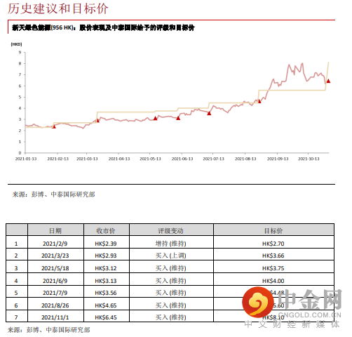 随着业务持续扩大,我们认为公司与大市值同业的估值差距将会渐渐收窄。根据 11 月 1 日的收市价及彭博的市场一致预测,较大市值同业龙源电力(916 HK;未评级)及新奥能源(2688 HK;未评级)的 2022 年市盈率分别为 16.7 倍及 15.6 倍,皆远高于我们对新天绿色能源预测的 8.0 倍市盈率。我们将公司 2022 年目标市盈率由 7.0 倍温和上调至 10.0 倍,并相应将 H 股目标价由 5.60 港元上调 44.6%至 8.10 港元,这对应 25.6%上升空间。重申“买入”评级。待公司的唐山 LNG 项目在 2022 年底前开始分阶段完成,加上风电装机容量不断增长,公司将可获得更充裕的估值上调空间。
