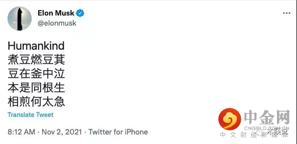 其后,是世界首富马斯克在其推特和微博上都发布了一首《七步诗》。