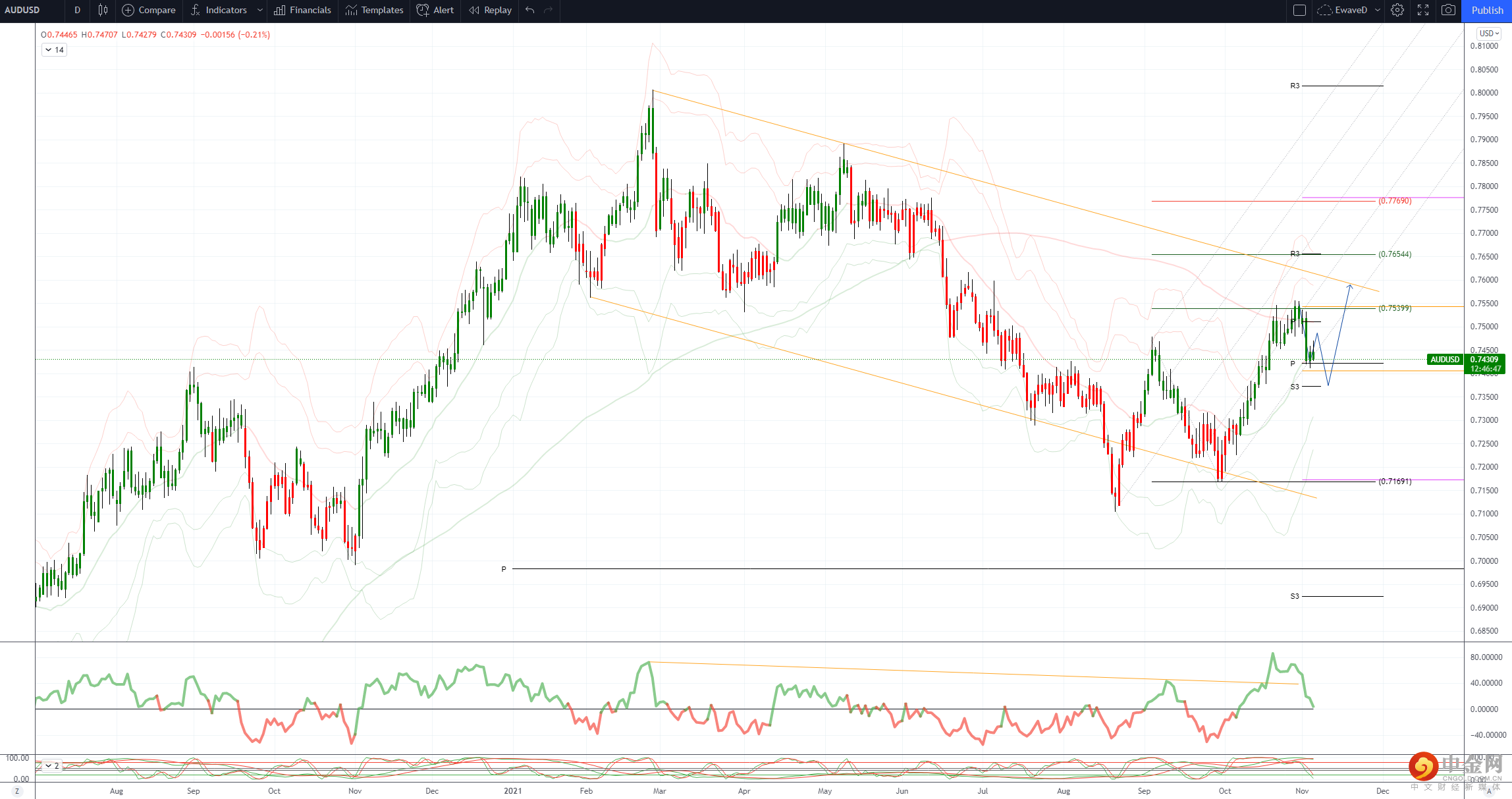 支撑位在 0.7443 的 21 天均线和 0.7170/0.7555 的 38.2 fibo 位在 0.7408