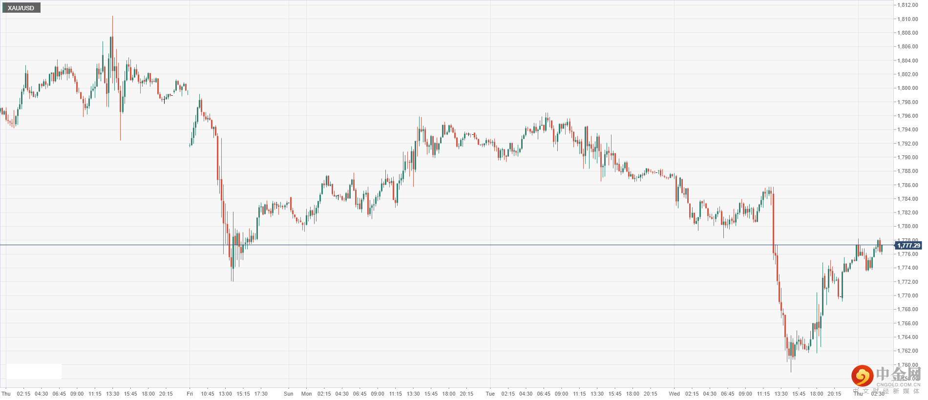 黄金兑美元周三盘中大幅下坠后回吐,今日开盘盘整在1777.29附近,因美国各项经济数据表现强劲,导致金价下行承压。