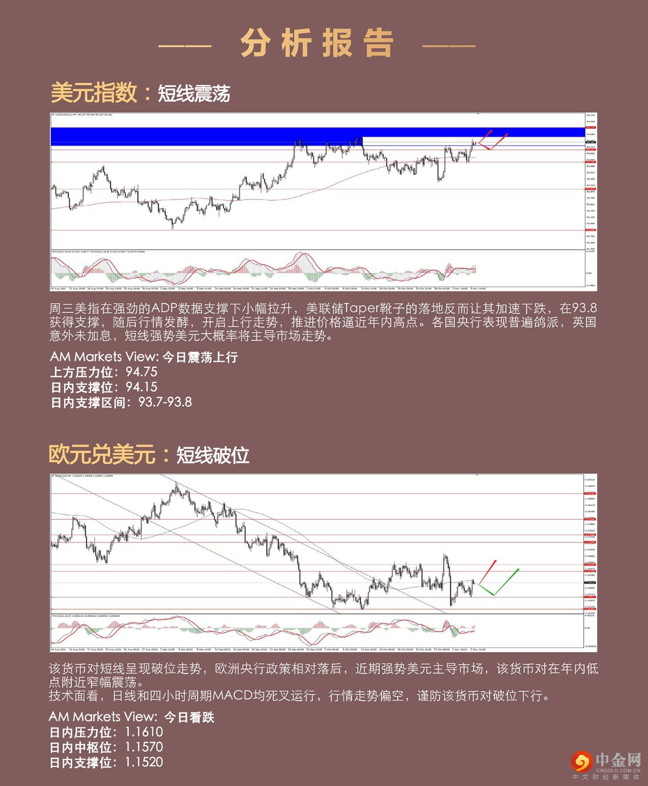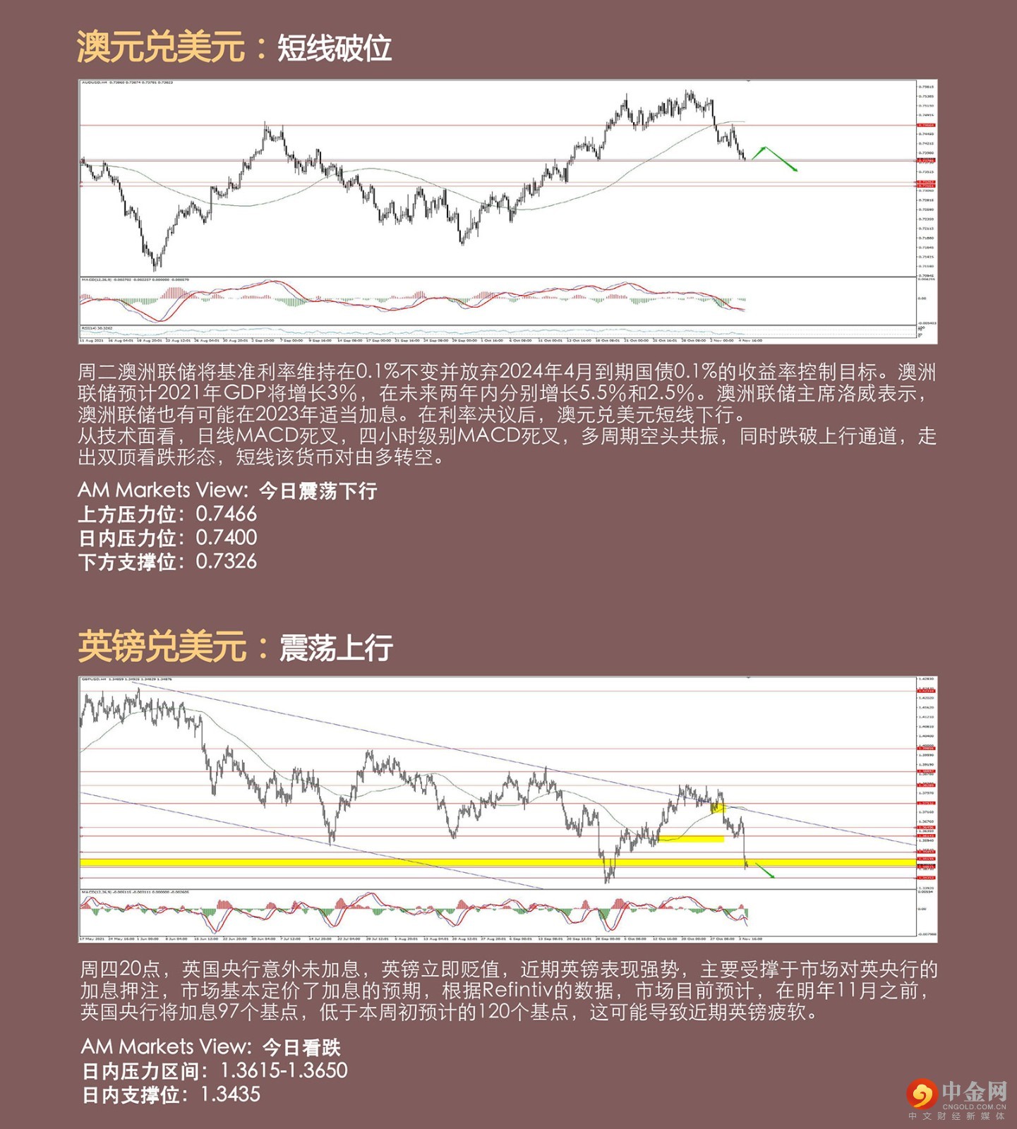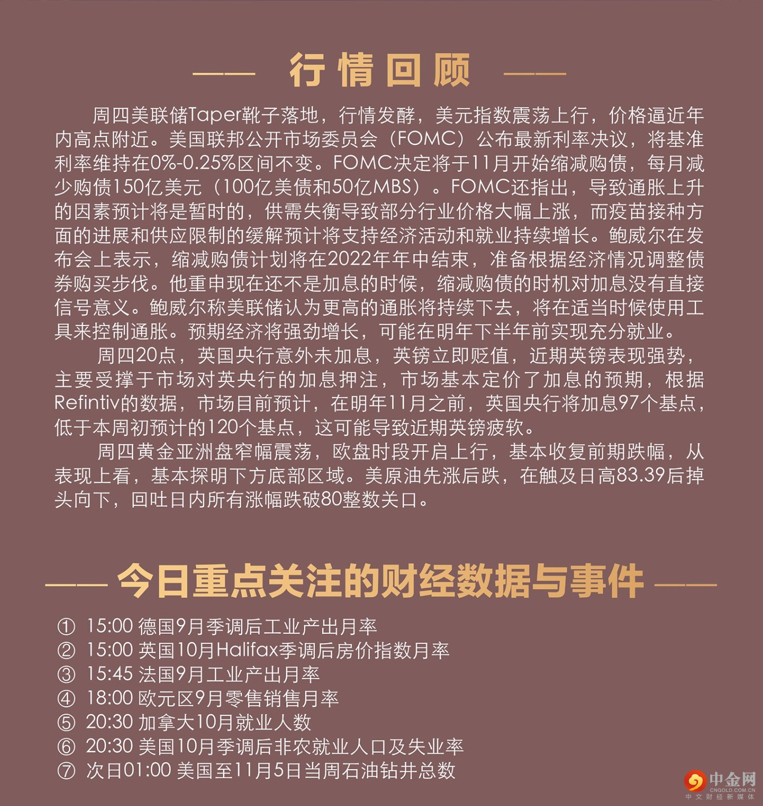 周四美联储Taper靴子落地,行情发酵,美元指数震荡上行,价格逼近年内高点附近。美国联邦公开市场委员会(FOMC)公布最新利率决议,将基准利率维持在0%-0.25%区间不变。FOMC决定将于11月开始缩减购债,每月减少购债150亿美元(100亿美债和50亿MBS)。FOMC还指出,导致通胀上升的因素预计将是暂时的,供需失衡导致部分行业价格大幅上涨,而疫苗接种方面的进展和供应限制的缓解预计将支持经济活动和就业持续增长。鲍威尔在发布会上表示,缩减购债计划将在2022年年中结束,准备根据经济情况调整债券购买步伐。他重申现在还不是加息的时候,缩减购债的时机对加息没有直接信号意义。鲍威尔称美联储认为更高的通胀将持续下去,将在适当时候使用工具来控制通胀。预期经济将强劲增长,可能在明年下半年前实现充分就业。 周四20点,英国央行意外未加息,英镑立即贬值,近期英镑表现强势,主要受撑于市场对英央行的加息押注,市场基本定价了加息的预期,根据Refintiv的数据,市场目前预计,在明年11月之前,英国央行将加息97个基点,低于本周初预计的120个基点,这可能导致近期英镑疲软。