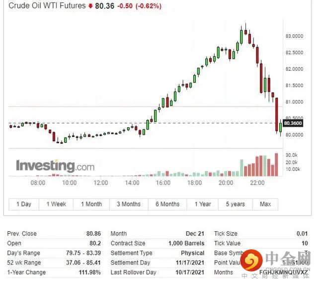 美油WTI在OPEC+拒绝超量增产的消息刚发布时涨幅扩大,一度重上82美元整数位,但随后回吐全部短线涨幅并日内转跌,下逼80美元,而且更接近亚太早盘出现的低点79.74美元/桶。