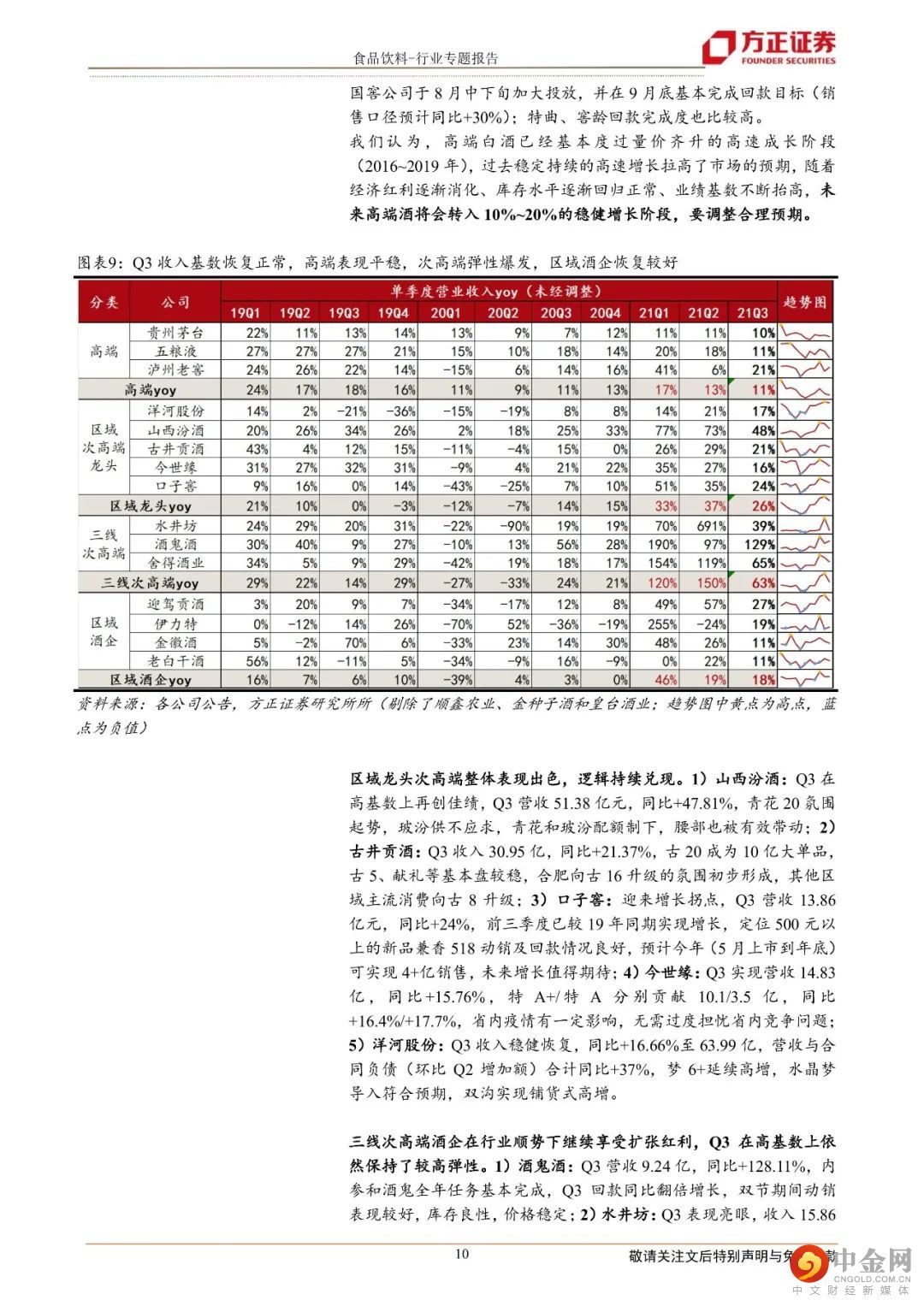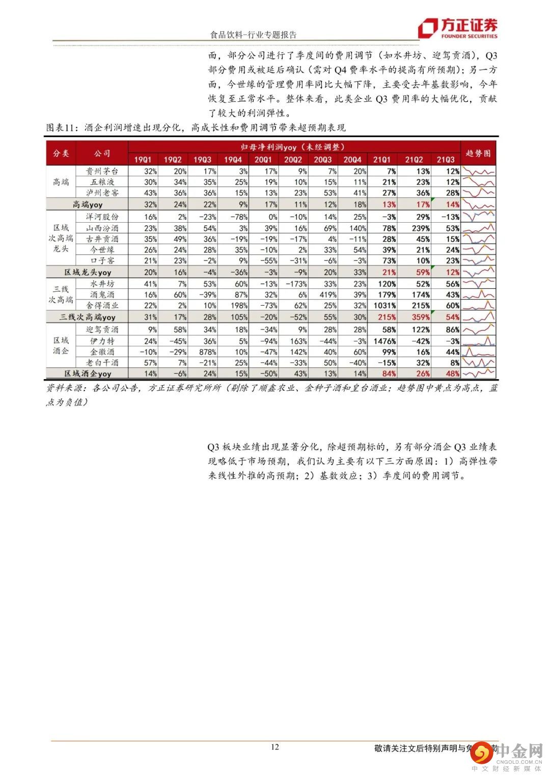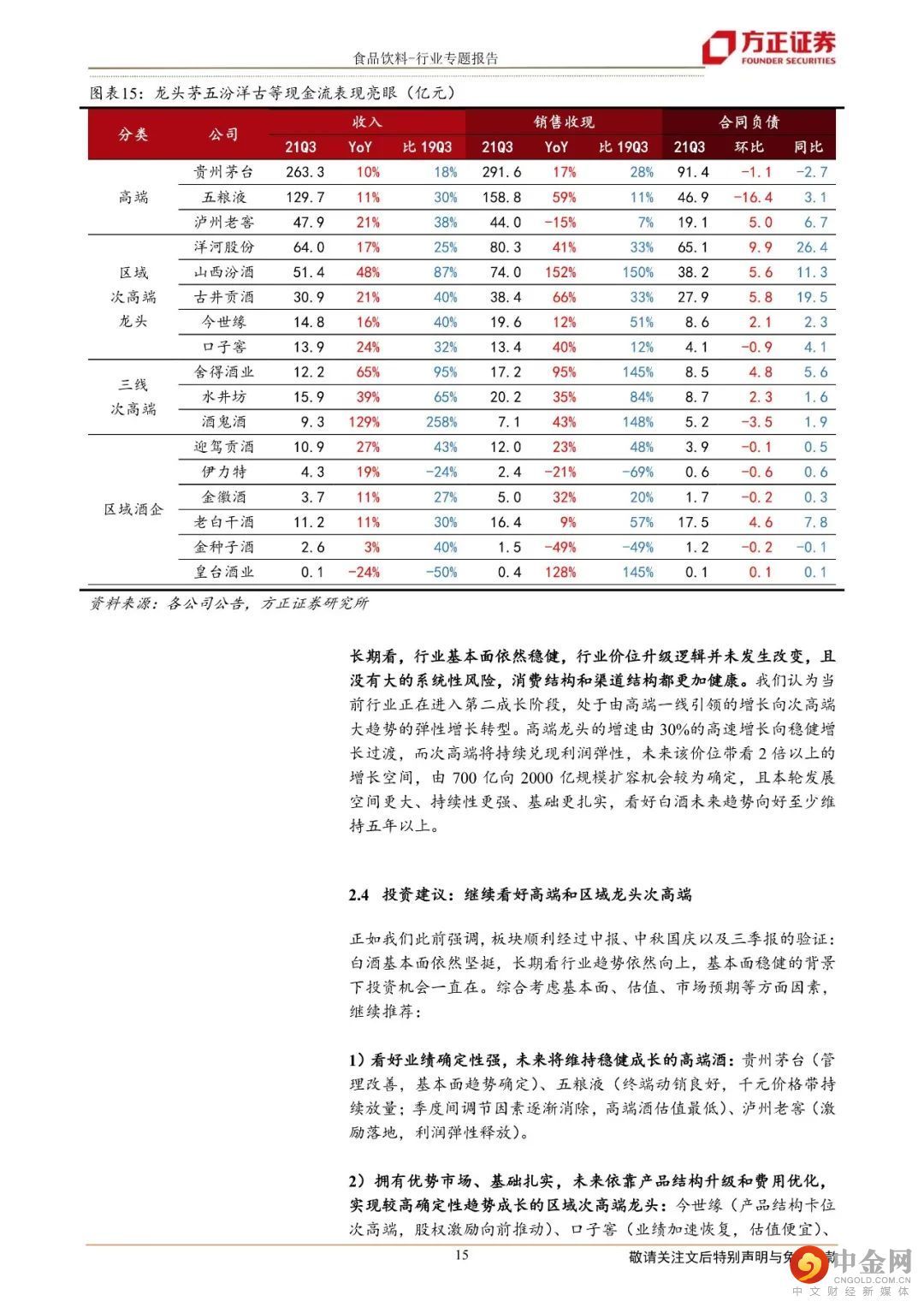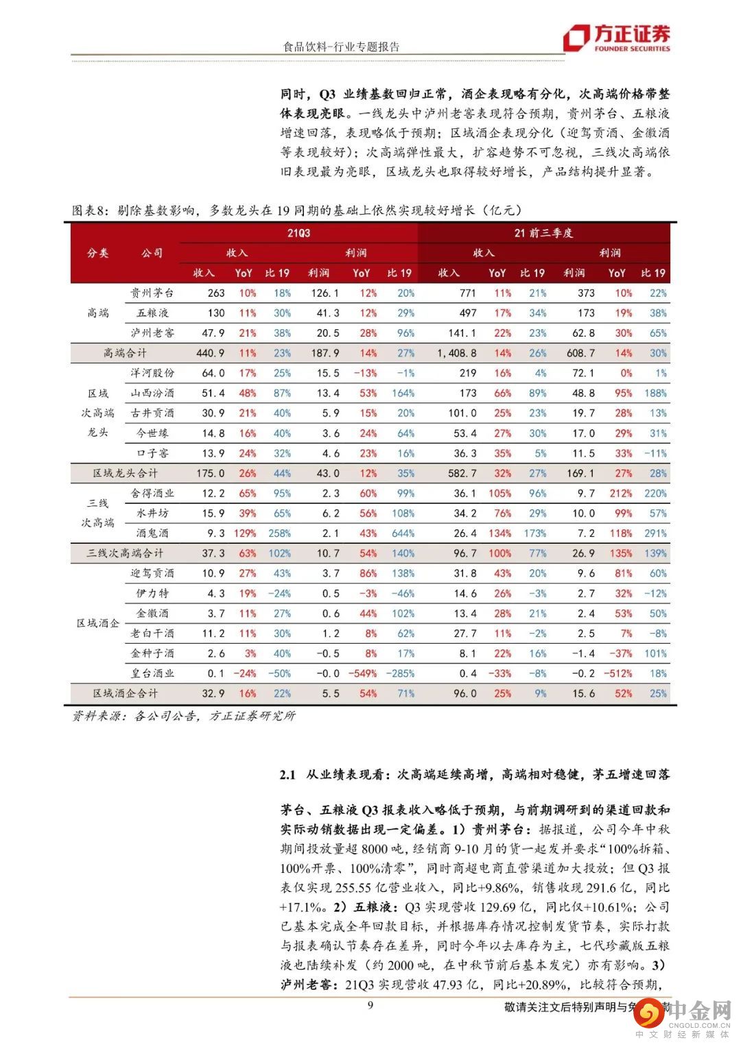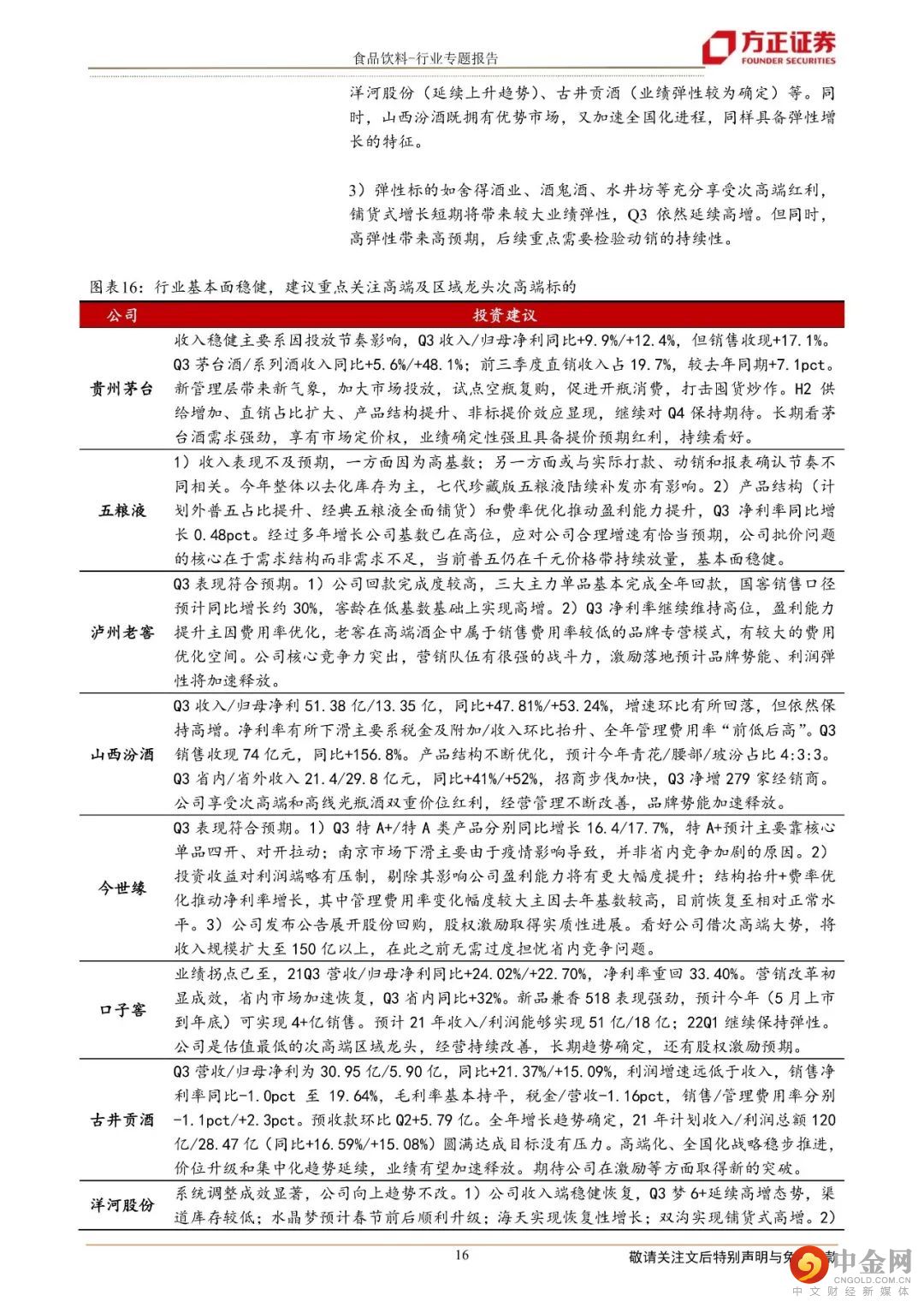 (1)板块Q3延续成长趋势,高端酒步入稳健增长,区域龙头业绩表现亮眼,三线次高端延续高增。(2)区域强势品牌表现均超预期,费用调节导致业绩波动,板块顺利通过Q3验证。(3)龙头全年业绩有保障,现金流和预收均留有余力,蓄力明年增长。(4)投资建议:高端茅五泸+次高端区域龙头