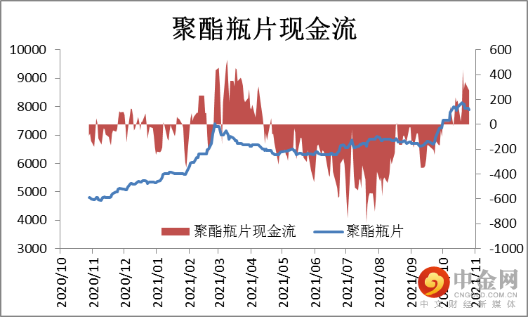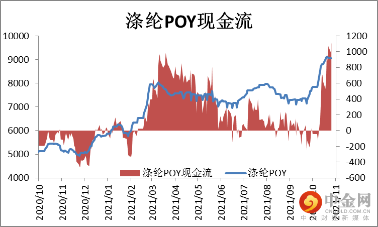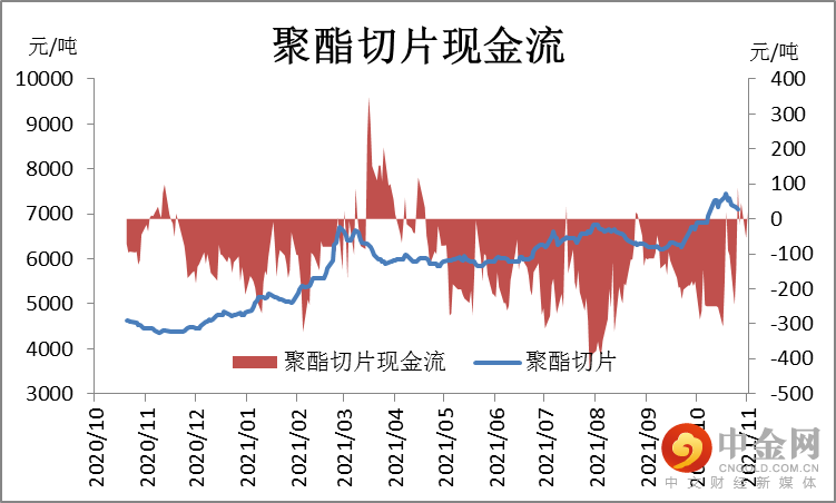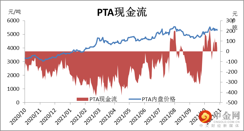 PTA月均加工费780元/吨,按 600元/吨加工费成本线计算,PTA 月均现金流180元/吨。10月PTA加工费呈现回升状态。2021年盈利最高的时间点在8月初,达到278元/吨,最低盈利在2月下旬为-393元/吨。
