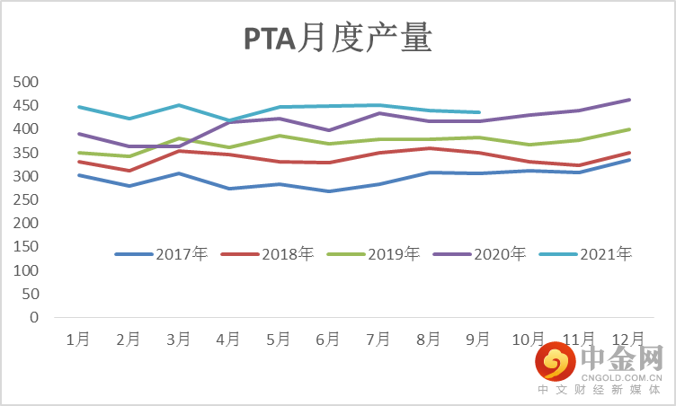 国内9月产量435万吨,根据产能基数 6623 万吨计算,开工负荷在 79.9%。10月预计国内 PTA 的产量为438万吨,本月新增恒力石化、逸盛大化、嘉兴石化、四川能投等装置检修。本月国内 PTA月均开工率78.6%,较上月下降 1.3%。