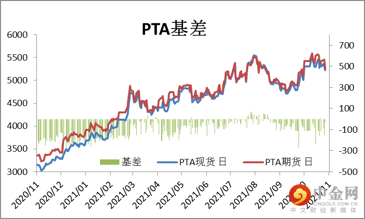 2021年10月PTA市场先扬后抑,上半月在成本强势支撑和供需双减的情况下,PTA价格拉涨,随后煤化工、动力煤等期货重挫拖累市场心态,PTA价格震荡下行。截止10月31日PTA现货均价5350元/吨,较上月价格上涨9.5%。10月逸盛大化、嘉兴石化、四川能投等PTA 装置计划外检修,暂缓了 PTA 供应过剩,对冲了下游聚酯减产对 PTA 需求的损失量。下游聚酯及终端织机开工负荷偏低,需求端整体偏弱。10月PTA现货供应较为充足,现货基差走弱。