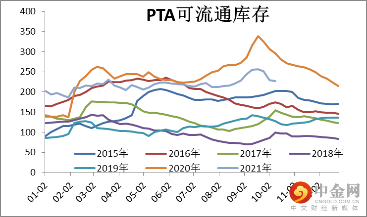 9月PTA 社会库存总量为293.65 万吨,较上月上升7.45 万吨,结束了连续6 个月的去库存。预计10月 PTA 社会库存至 313.58 万吨附近,库存累积19.93 万吨。PTA可流通库存去库放缓。