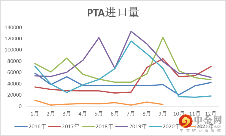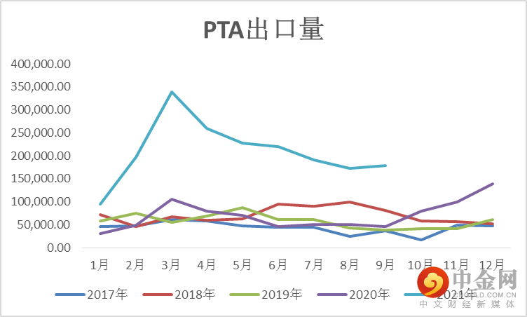 年9月我国PTA当月出口量为177983.01吨,累计出口量为1877465.22吨,当月出口金额为12797.06万美元,累计出口金额为118414.27万美元,当月出口均价为719美元/吨,累计出口均价630.71美元/吨,出口量环比上涨3.02%,出口量同比上涨292.19%,累计出口量比去年同期上涨255.33%。