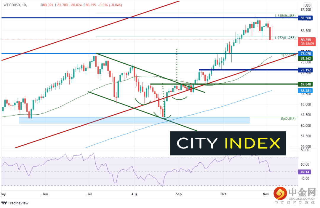 自从2020年4月暴跌以来,西得州油价一直得到买盘青睐,在8月形成头肩底形态且在9月10日站上69.84的颈线所在。西得州油价快速击穿该形态目标78.00,后于10月25日止步于由水平阻力位和7月6日高点到8月23日低点行情的161.8%扩展位相汇而成的85.50/86.50区域附近。在今天OPEC+会议召开之前当然涌现了获利回吐盘。