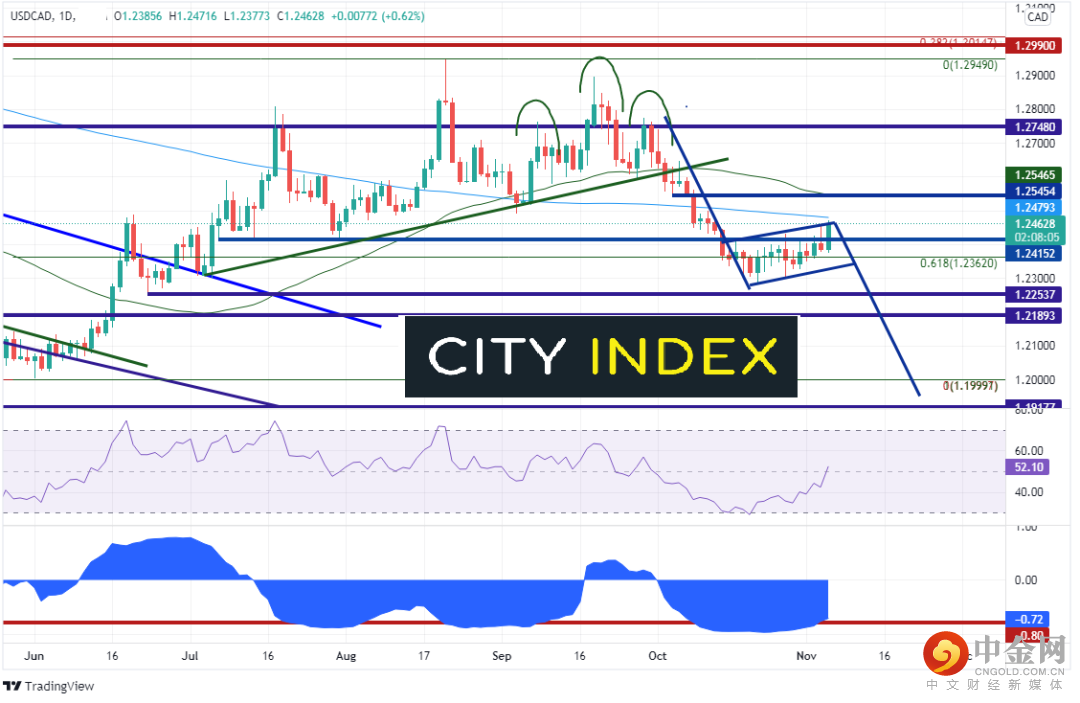 美元/加元与油价相关联,目前的相关系数为-0.72,而我们寻找的是被认为关联度高的系数,即低于-0.80的水平。不过,日图上还是可以很容易就看出这两者仍处于负相关联系。要想相关系数再次变成关键因素,需要油价结束当前大跌的势头,或者美元/加元加速上扬。美元/加元目前正在测试日图旗形形态的趋势线阻力兼200天均线所在的1.2479,如果站于其上,旗形形态失效,价格可能反击水平阻力位兼50天均线所在的1.2545。(如果油价下跌,相关性可能再度变得紧密)。美元/加元如果下挫,第一个支撑位在今天低点1.2377,接着是旗形趋势线1.2325,然后是10月21日以来低点1.2288。(如果油价上涨,相关性可能再度变得紧密)。
