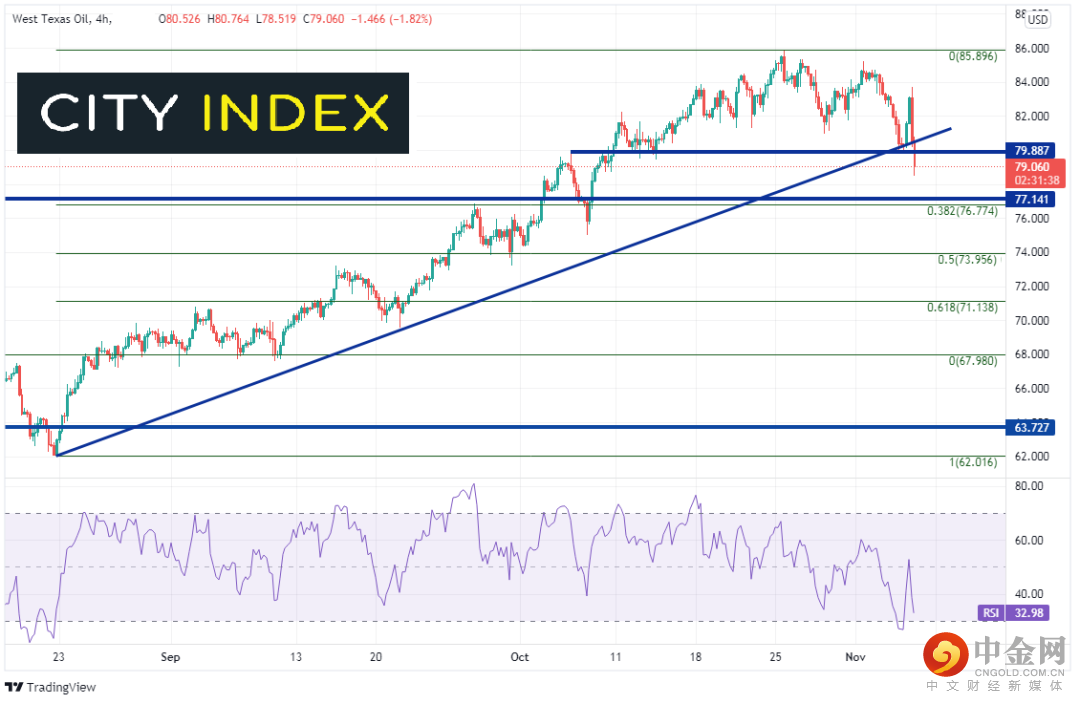 西得州油价当天在OPEC+决议公布之前上涨,原因在于市场意识到OPEC不会增产。但油价在上述宣告之后自83.70高点调头向下,跌至78.52低点,跌幅接近6.2%。有关美国可能向市场释出战略储备石油的传言令人兴奋不已。(拜登不也说过将出售部分战略储备石油用于基建吗?)油价在收盘前反弹,当天跌幅收窄至1.75%。油价4小时图下破8月22日以来的上斜趋势线兼水平支撑位所在的79.88,下个支撑位在遥远的7月以来前高点77.14,接着是8月22日低点到10月25日高点行情的38.2%回档位,即76.77附近,然后是50天均线所在的76.36(请看日图)。阻力位现落于前支撑位79.88、周四高点83.70。