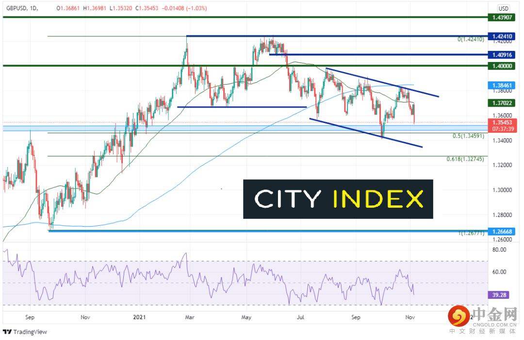 英镑/美元日图从10月29日开始切实走低,当天受到月末美元买盘的冲击,下跌之前曾上攻7月29日以来下斜趋势线所在的1.3800附近阻力。该货币对周四无力站上50天均线1.3702后跌至略高于水平支撑位所在的1.3519处,该位之下是一个支撑带,由2020年9月23日低点到2021年6月1日高点行情的50%回档位所在的1.3459和9月29日低点所在的1.3411构成。阻力位在前述50天均线、下斜趋势线(仍落在1.3800附近)、200天均线1.3846(其曾在10月底挫败了反弹企图)。