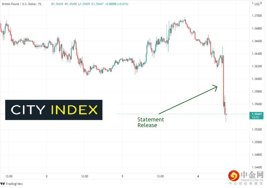 英镑/美元在上述声明发布后旋即自1.3637暴跌至1.3554,周四迄今最低跌至1.3521,跌幅超过1.1%。