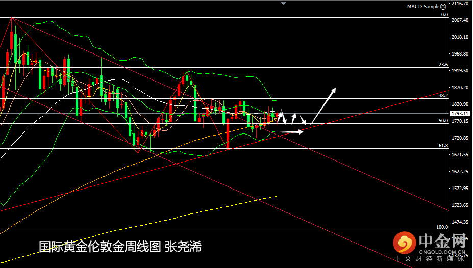 技术上:周线级别:金价本周在触及50%回撤线后反弹转强,目前展现的长下影线也暗示多头占据优势,附图指标上,KDJ及MACD也保持金叉看涨信号,暗示仍存进一步走高,但本周仍未收线,日内将关注重磅非农数据,且也有利空预期,另外暂时也面临30周均线压力,日内追涨将续谨慎。下方回落关注中轨及5-10周均线等支撑可选择再度看多。