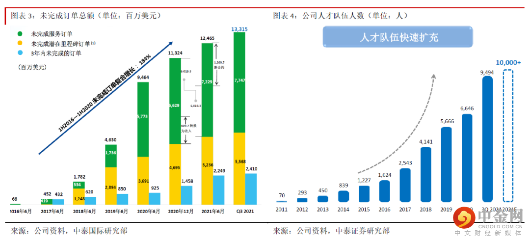 我们参加了公司日前举办的投资者会议。管理层表示前三季度经营情况理想,早前市场忧虑的原材料与人手问题已得到妥善解决,因此上调2021年收入增速指引至75%,为年内公司第二次上调收入指引,基于:1)强劲的项目数量增长:公司前三季度项目总数增加114个项目(2019-20年全年新增项目总数分别为59与103个),其中三季度获得35个项目,获取项目能力不断提升。从项目分布看,公司目前进行中的项目集中于需求空间广阔的优质赛道,包括单抗、双抗、抗体偶联物、融合蛋白等。2)公司从外部获取新项目能力不断加强,“赢得分子”战略非常成功:公司原来很多项目来自上游传导,但是近年来从外部获取项目能力不断提升。2021年前三季度从外部获得13个项目(2018年至今总共35个),包括5个临床三期或以后的项目,表明市场认可度在提升。公司后期临床及商业化生产项目的利润率通常较高,获得这些项目有助于提升利润率。3)新冠项目带来的收入超越预期:公司预计2021年的新冠相关订单总额将超越早前预期达到约30亿元。4)公司在手订单总额持续强劲增长:公司的在手订单总额近年来持续快速增长,9月底在手订单总额从去年底的113.2亿美元增加到133.1亿美元,因此业绩能见度很高。5)公司人才招募有序进行,有助于确保业绩的长期稳健增长:公司年中曾经表示不确定能否招到足够的人才满足迅速增长的订单需求,但是问题已圆满解决,人才队伍从6月底的6,646人扩充到9月底的9,494人,充足人才资源确保公司业绩稳健增长。
