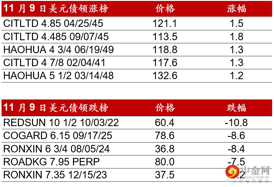 昨日(11月9日),中国高收益债券市场延续较弱情绪,先前B评级的抛售持续扩散至BB评级债券。价格较高的债券如龙光/旭辉/碧桂园下跌约5-10pts,其他债券如世茂/宝龙/中骏/时代/新城也下跌约3-6pts。上周跌幅较大的债券因进一步下跌空间不大反而表现相较稳定,佳兆业/融创/奥园下跌约1-3pts。