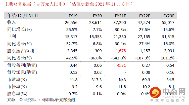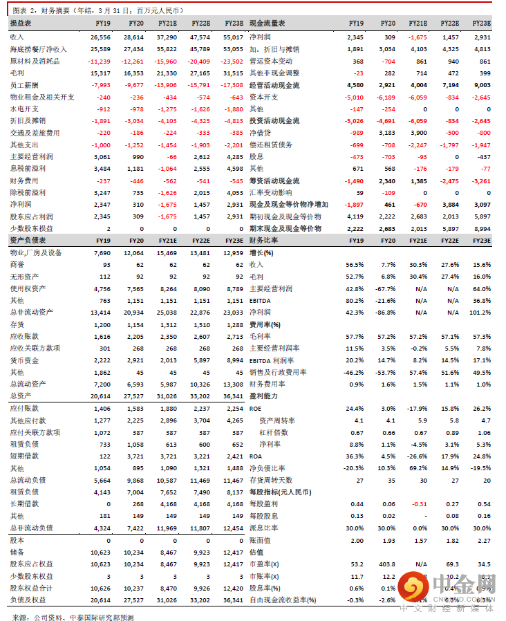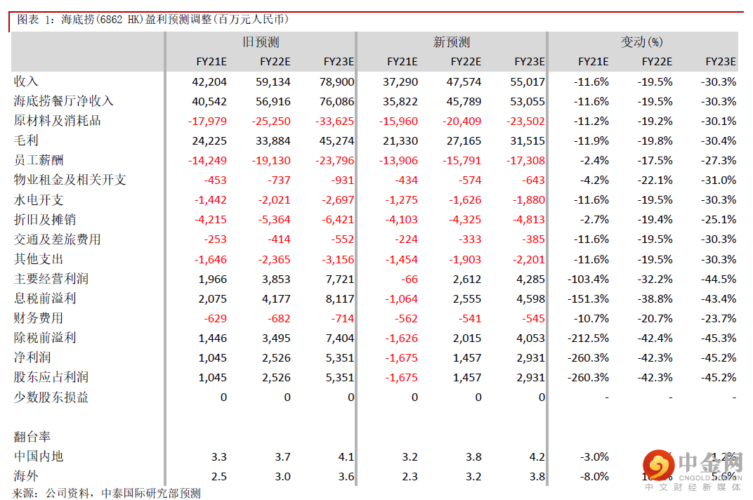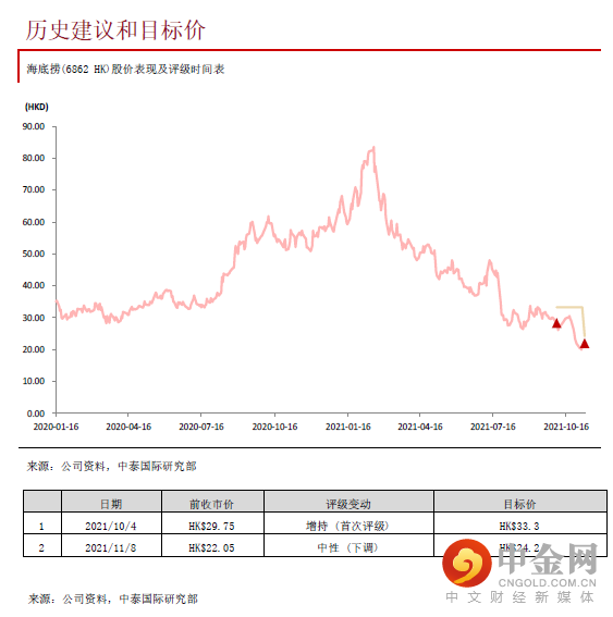 由于公司大致维持现有员工数目不变,因此短期的成本压力可能大于收缩亏损门店带来的利好,而关店将录得一次性资产减值开支。从中期角度看,管理层壮士断臂,关停流量及经营效应较差的门店有助提升现有旧店的翻台率及集团整体的经营效率,因此把预测22/23年内地门店的翻台率从3.7/4.1次上调至3.8/4.2次。考虑到未来集团的拓店步伐逊于原先预期,以及疫情对餐饮业的持续影响,我们把21-23年收入预测分别下调11.6%/19.5%/30.3%;股东应占利润分别下调260.3%/42.3%/45.2%至-16.8亿/14.6亿/29.3亿元;预测21-23年EPS分别为-0.31/0.27/0.54元,目标价从33.3港元下调至24.2港元,下调至“中性”评级。