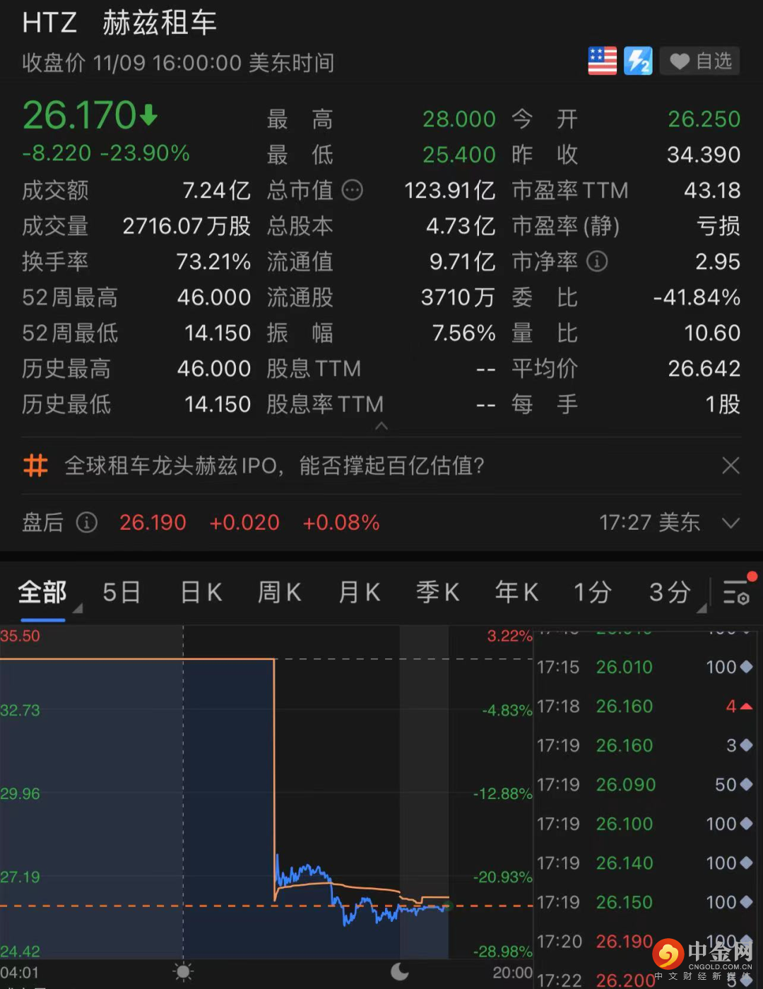 赫兹租车股价报26.17美元/股,较发行价下跌23.9%,最新总市值为123.91亿美元。