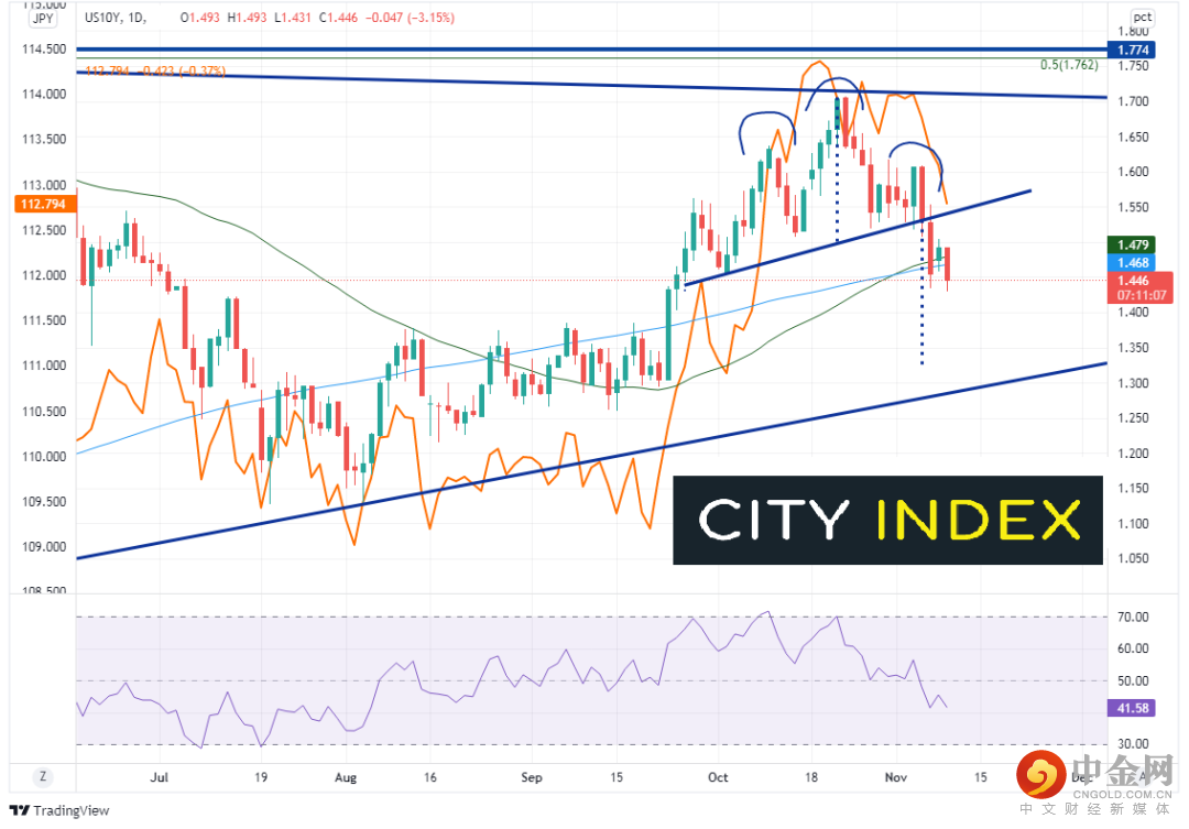 我们经常说美国10年期国债收益率与美元/日元通常同时波动。下图是美国10年期国债收益率图表,上面的橙色线是美元/日元的价格走势,我们可以轻松地看到两者是如何互动的。收益率在10月21日到达近期高点1.704%,随后因11月3日FOMC会议逼近而回撤至头肩顶形态的颈线,即1.55%附近。10年期美债收益率在11月4日突破前述颈线,下探1.33%的目标。请注意,收益率在周二既击破50天均线,也攻克200天均线,两者分别落在1.479%和1.468%。如果收于其下,可能利空美债收益率,亦不利于美元/日元。支撑位在1.378%和上斜趋势线1.29%。美PPI 同比增长8.6%,供应链问题冲击美元