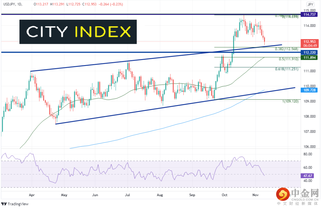 这就引人思考“美元/日元可能走向何方”的问题?9月FOMC会议以来,美元/日元脱离通道支撑位109.12后不断走高,于10月20日创下114.70高点,那是2017年以来的阻力位。美元/日元在走高的途中攻克水平阻力位兼通道上轨趋势线112.22附近,使其现在转变为支撑位。但该位之上是通道上轨趋势线兼9月22日低点到10月20日高点行情的38.2%回档位,即112.57附近。112.22下方是又一支撑带,由50%回档位和50天均线构成,落在111.90附近。短线阻力位在周二高点(兼10月28日低点)113.29,如果站于其上,价格有望摸至10月20日高点114.74。