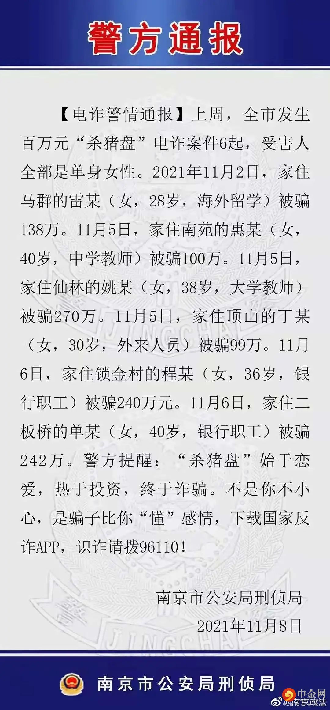 南京市委政法委官方微博11月8日下午发布的一则电诈警情通报显示,上周,南京全市发生百万元及以上“杀猪盘”电诈案件6起,受害人全部是单身女性,其中一名大学教师被骗270万元。