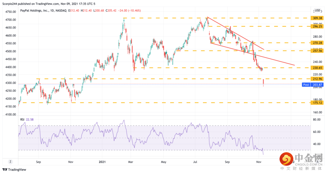 贝宝公司的股价下跌10.5%,跌至212美元的关键支撑线下方。