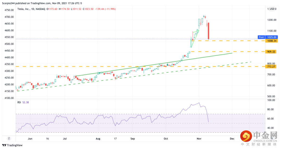 特斯拉的股价今天下跌了12%,其股价目前略高于1000美元的支撑线。