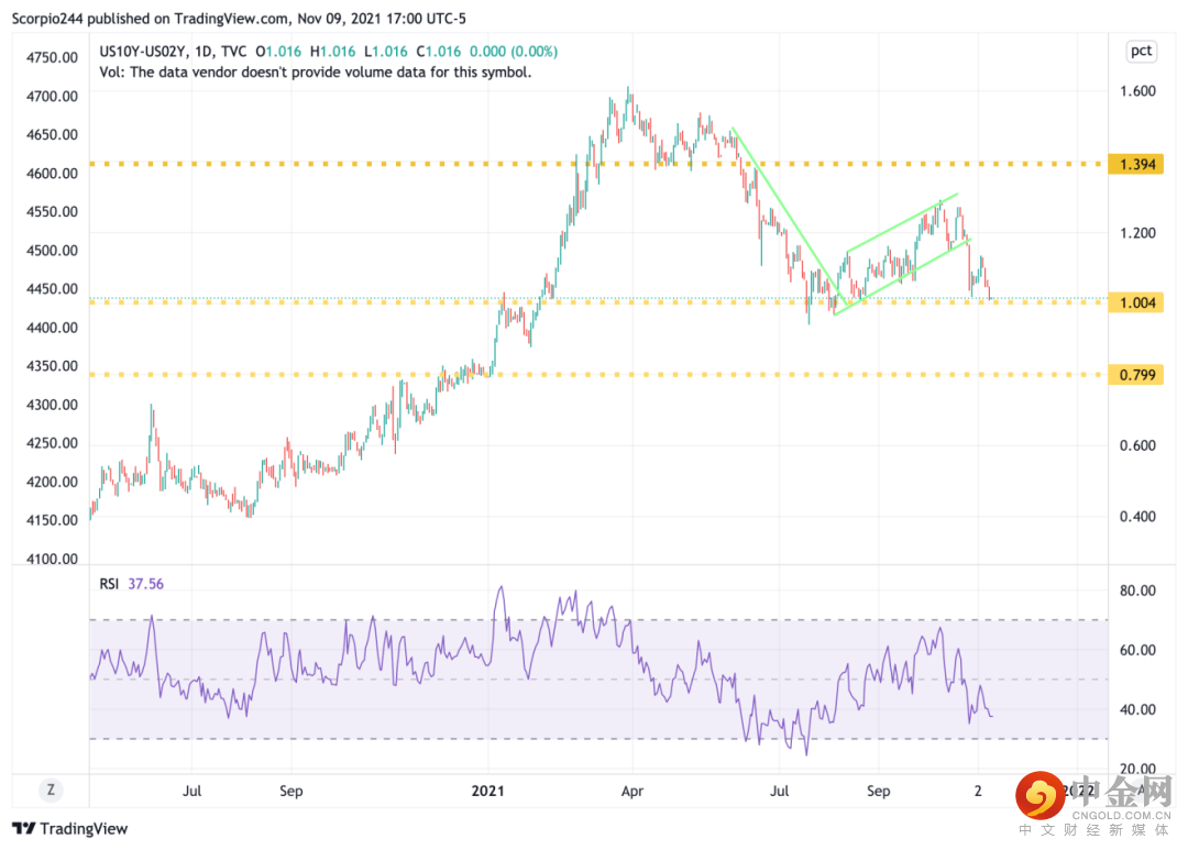 10年期美国国债收益率下跌5点至1.44%,2年期国债收益率下跌至0.42%。这导致收益率曲线的价差缩窄至1%,并且位于关键的支撑线上。