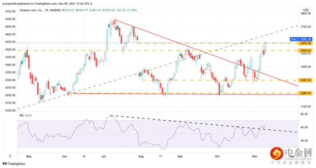 亚马逊的股价仍在3575美元的缺口上方徘徊,仍有可能突破至阻力线上方。