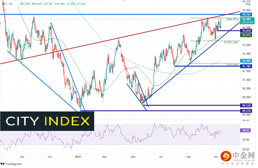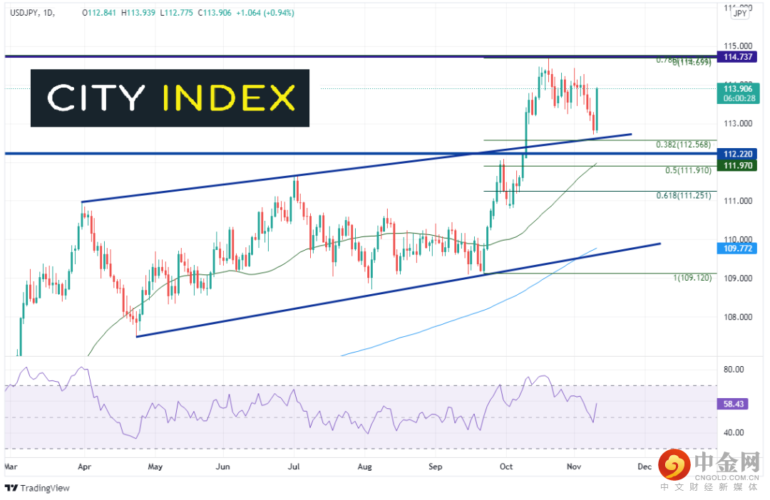 黄金上涨的同时美元/日元和美元指数也走高:这完全符合通胀读数高于预期下对市场可能走势的期待。美元/日元从我们周二讨论过的支撑位反弹,即上升趋势线兼9月2日低点到10月20日高点行情的38.2%回档位附近。下个阻力在10月20日高点114.75。