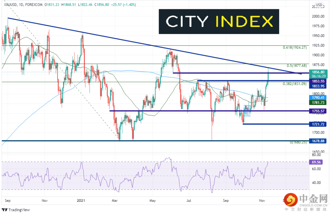 过去4天黄金(现货黄金/美元)不断走高,在CPI数据发布后进一步冲高,击穿前高点和2020年8月高点到2021年8月低点行情的38.2%回档位,摸至6月17日以来最高点,还攻克前低点1853.55。接下来的阻力在2020年9月1日以来下斜趋势线1869附近,然后是前述行情的50%回档位所在的1877.68。