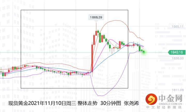 美盘开盘,公布的美国10月份CPI创1990年以来最大升幅,显示美国上月通胀率高于预期,在通胀大幅飙升的支撑下,金价也在数个巨量的砸盘下连续冲高,在突破7-9月阻力1836美元后,又进一步破位给出的目标位1850美元,最终触及1867.99美元的日高点,但通胀的大幅飙升也意味着引发了美联储可能提前加息的猜测,使得提前加息的预期再度升温,另外强劲的数据也推动美元就美债大幅飙升,也对金价有一定的打压,故此金价在先涨后又产生回落,并最终收于1849.08美元,日振幅45.61美元,收涨17.1美元,涨幅0.93%。