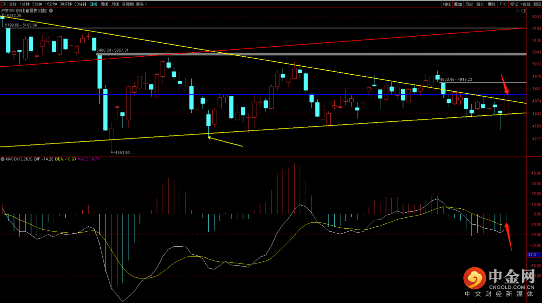 沪深300突破了下降趋势线,短期关注是否能够站稳下降趋势线,一旦有效站稳后续大概率会向上去回补前期的跳空缺口。在后续行情中重点关注macd量柱的变化在没有出现再次扩张之前,反弹大概率会延续。