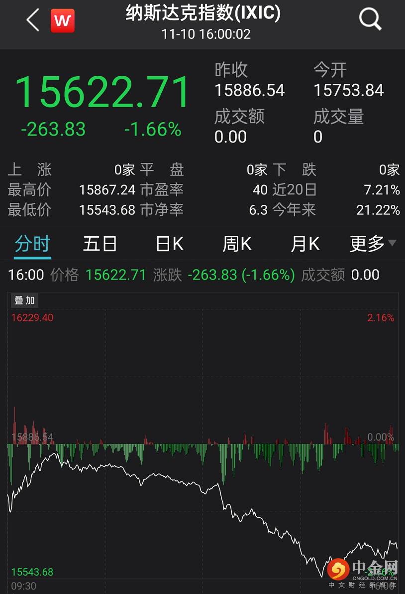 当日晚间,美股大型科技股遭遇抛售,谷歌跌2.03%,苹果跌1.92%,亚马逊跌2.63%,Facebook跌2.3%,微软跌1.53%,奈飞跌1.38%。导致纳指大跌1.66%,创10月4日以来最大收盘跌幅,报15622.71点,创11月1日以来收盘新低。