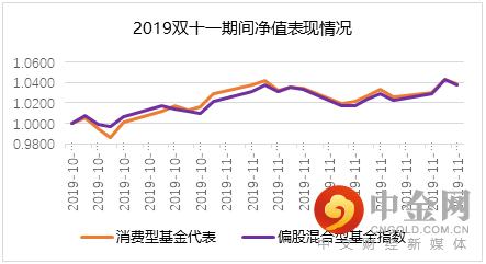2019年双十一期间市场震荡上行,消费型基金代表组合的收益与对标基准旗鼓相当。