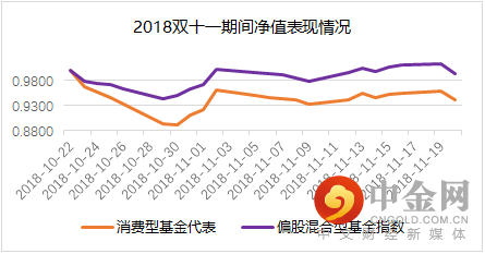 2018年双十一期间市场偏震荡下行,消费型基金代表组合的收益不及对标指数,且回撤较大。