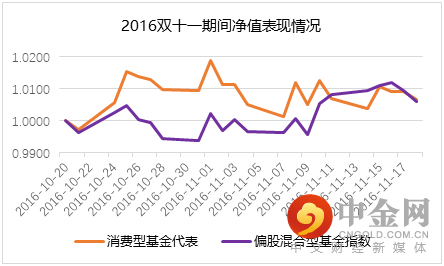 2016年双十一期间市场偏震荡,消费型基金代表组合的表现与对标指数表现相当。