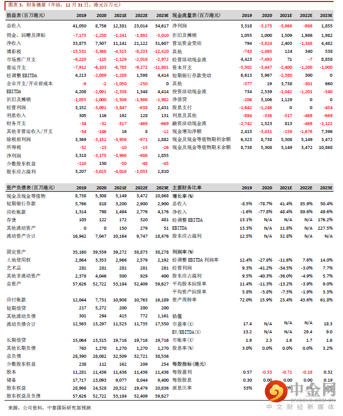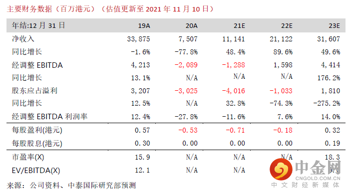 上葡京于21年Q3录得5,700万港元的中场博彩收入,考虑到项目开业仅约60天左右,而8月澳门因疫情实际有半个月处“半封关”状态,上葡京的爬圾进度符合我们预期。管理层透露上葡京余下设施推出的时间表:拥有271家客房的Karl Lagerfeld(老佛爷)品牌酒店、免税店及新八佰伴第一期将会于今年末推出;拥有271家客房的Palazzo Versace(范思哲宫殿酒店)及三个VIP房间将紧接于22年Q1推出;其他餐饮及零售商店亦于22年分阶推出。管理层预计若港、澳在明年Q2(北京冬奥后)通关,上葡京可于Q2录得EBITDA的盈亏平衡。