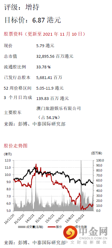 我们对澳博控股前景较有信心,包括:1) 上葡京开业后有助提升公司在路氹地区的市场份额;2) 预计明年内地或港、澳进一步放宽出入境措施下,核心中场可接力复苏,利好澳博的半岛项目;3) 受《博彩法》的咨询文件建议(例如未来博企的派息政策、提升澳门居民在公司的资本所占比例等)影响较低,澳博纯华资的背景,续牌确定性较高。然而短期内,疫情、疫苗接种率及通关仍然是影响业绩的最关键因素。
