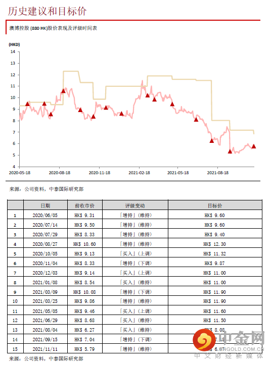 因应Q3业绩及近期疫情的影响,我们下调澳博控股21-23年经调整EBIDTA预测8.8%/13.3%/12.7%至-12.9亿/15.9亿/44.1亿元,把目标价从7.37港元下调至6.87港元,相当于22年及23年32.9倍及10.3倍EV/EBITDA,维持“增持”评级。