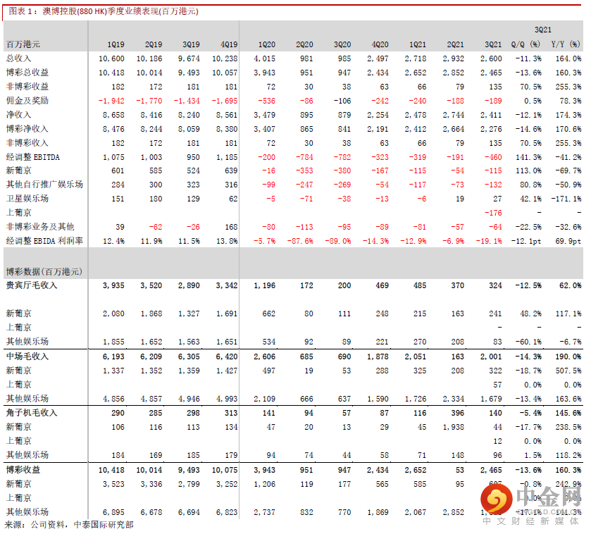澳博控股21年Q3净收入为24.1亿港元(下同),同比+174.3%/环比-12.1%;博彩收入环比-13.6%,跑赢行业平均(环比-26.1%),市占率按季增加1.9个百分点至13.5%;Q3的经调整EBITDA为-4.6亿元,略逊我们预期,主要是上葡京在7/8月疫情反复下开业,博彩收入增幅不能弥补上葡京开业的营运成本,导致亏损按季扩大。集团目前的日均营运开支为1,550万港元(其中上葡京为410万港元,预计Q4会增加至600-650万港元),未来会继续将员工从其他现有场所调拨至上葡京,因此总体营运成本预计不会有太大提升。
