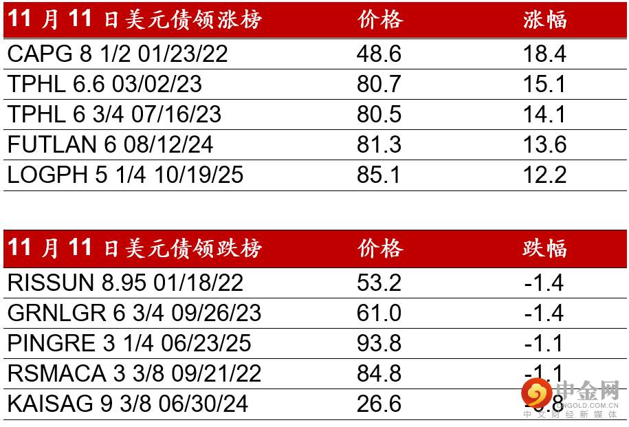 昨日(11月11日),中国高收益债券市场情绪进一步回稳。受恒大于宽限期截止前支付延迟兑付的票息消息以及更多积极的政策信号推动,大部分债券在较好买盘下再次上涨。世茂在提取15亿元人民币贷款消息的推动下,大幅上涨约7-9pts。BB评级债券如碧桂园/旭辉/龙光也一度上涨约2-6pts,但午后因部分帐户获利卖出,涨幅略有回吐。奥园因30亿元资产出售及贷款的消息,前端债券大幅上涨约10-20pts。其他债券如融创/禹洲/中骏/宝龙/合景泰富上涨约5-10pts,融信/正荣也上涨约3-5pts。市场价格已反映较大的违约/重组/交换几率如恒大/佳兆业等则稍微下跌0.5-1pt。