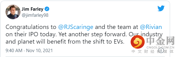 福特汽车的首席执行官Jim Farley对Rivian公司的高调上市表示祝贺。